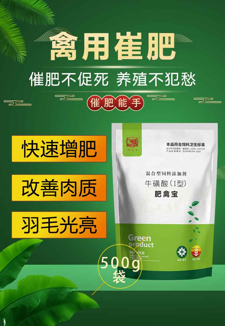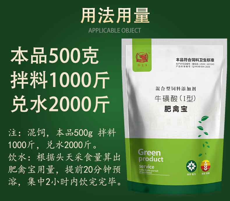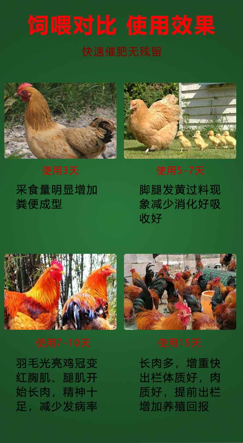 【用法用量】 本品广泛应用于禽类保健,尤其适宜作为饲料配方直接加入,混饲,本品500g拌料1000斤 2000 饮水:根据头天采食量算出肥禽宝用量,提前20分钟预溶,集中2个小时内饮用完毕。