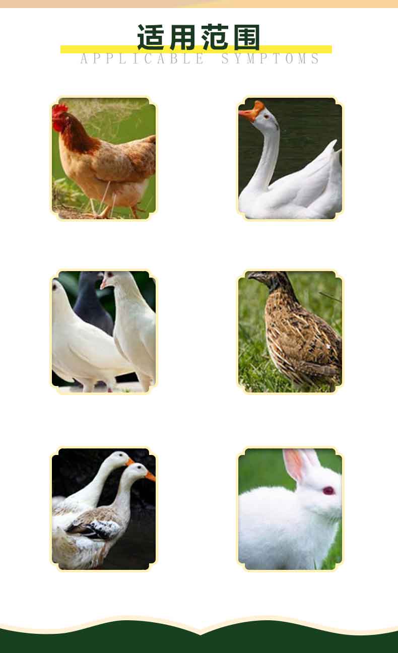 【使用对象】 黄、白羽肉鸡、三黄鸡、蛋鸡、蛋鸭、肉鸭、鹅、鹌鹑、鸽子等禽类。