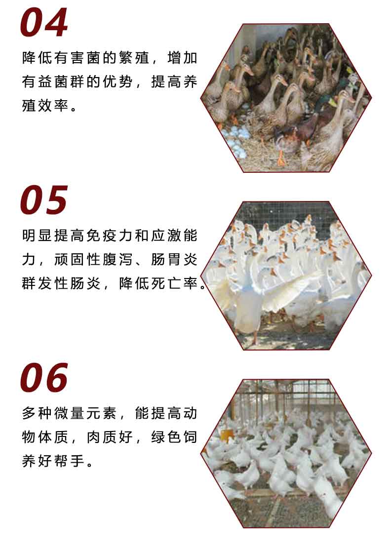 【主要成分】 枯草芽孢杆菌、嗜酸乳杆菌、酿酒酵母菌、抗菌肽、纤维素酶、糖化酶、木聚糖酶、酸性蛋白酶、维生素、矿物质、氨基酸、 总菌含量≥100亿个/克。
