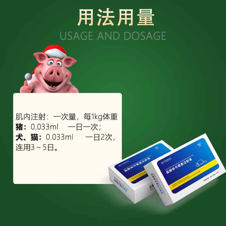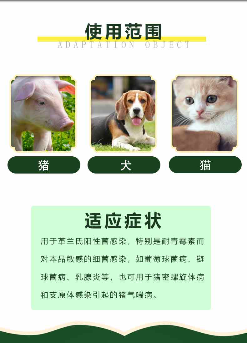 【用法用量】肌内注射:一次量,每1kg体重,猪0.033ml,一日一次;犬、猫0.033ml,一日2次,连用3-5日。