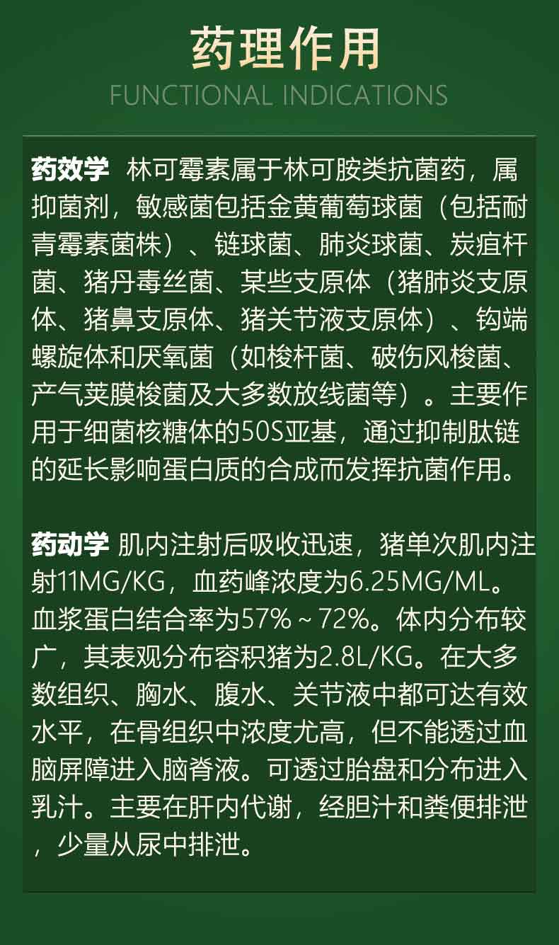 【作用用途】林可胺类抗生素。用于革兰氏阳性菌感染,亦可用于猪密螺旋体病和支原体等感染。