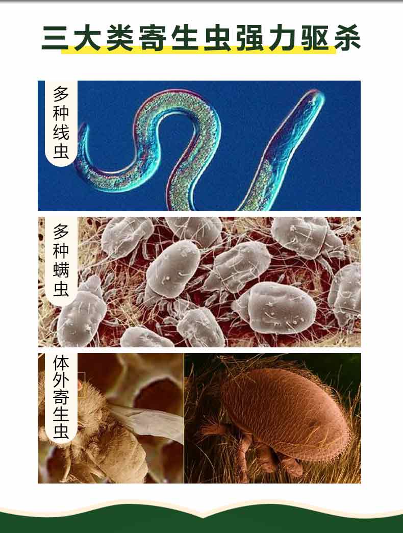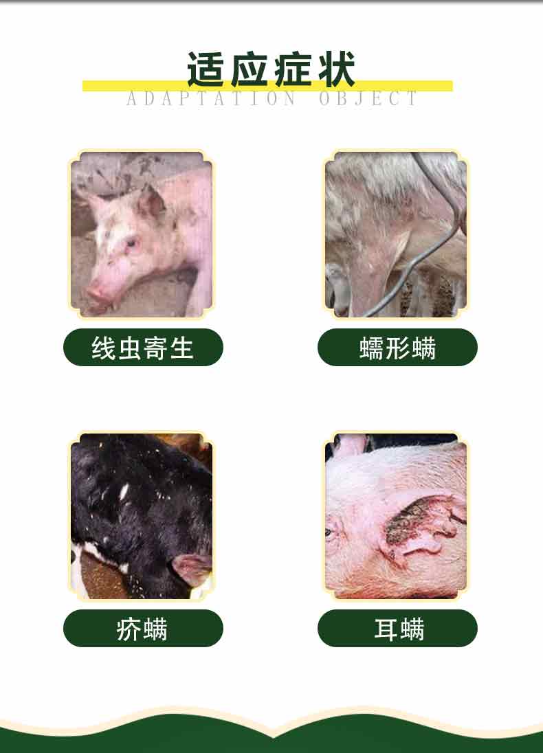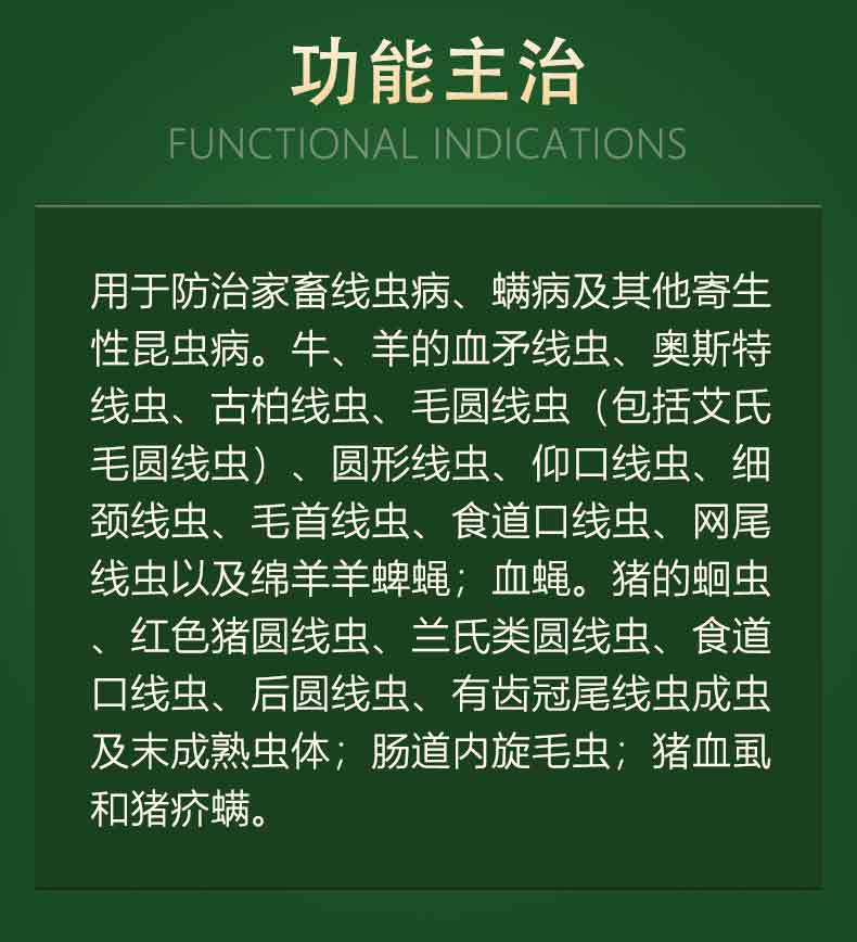 【适 应 证】用于防治家畜线虫病、螨病及其他寄生性昆虫病。牛、羊的血矛线虫、奥斯特线虫、古柏线虫、毛圆线虫(包括艾氏毛圆线虫)、圆形线虫、仰口线虫、细颈线虫、毛首线虫、食道口线虫、网尾线虫以及绵羊夏伯特线虫成虫、第四期幼虫;节肢动物如蝇蛆、螨和虱等;嚼虱和绵羊羊蜱蝇;血蝇。猪的蛔虫、红色猪圆线虫、兰氏类圆线虫、毛首线虫、食道口线虫、后圆线虫、有齿冠尾线虫成虫及末成熟虫体;肠道内旋毛虫;猪血虱和猪疥螨。