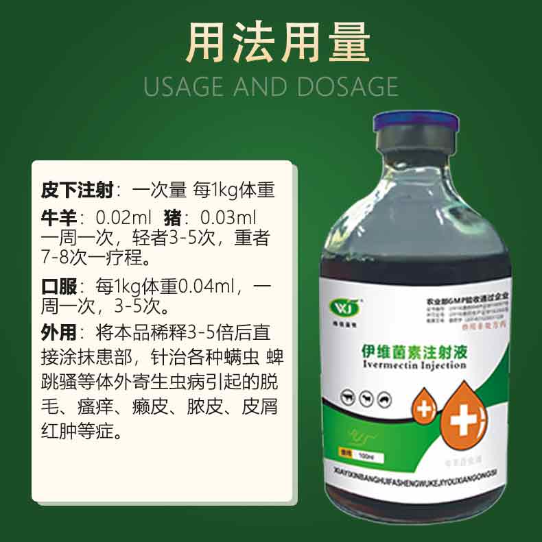 【用法用量】皮下注射:一次量 每1kg体重,牛羊0.02ml,猪0.03ml,一周一次,轻者3-5次, 重者7-8次一疗程。口服:每1kg体重0.04ml,一周一次,3-5次。外用:将本品稀释3-5倍后直接涂抹患部,针治各种螨虫、蜱、跳蚤等体外寄生虫病引起的脱毛、瘙痒、癞皮、脓皮、皮屑、红肿等症。