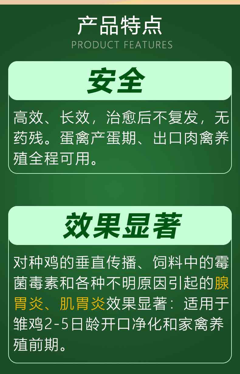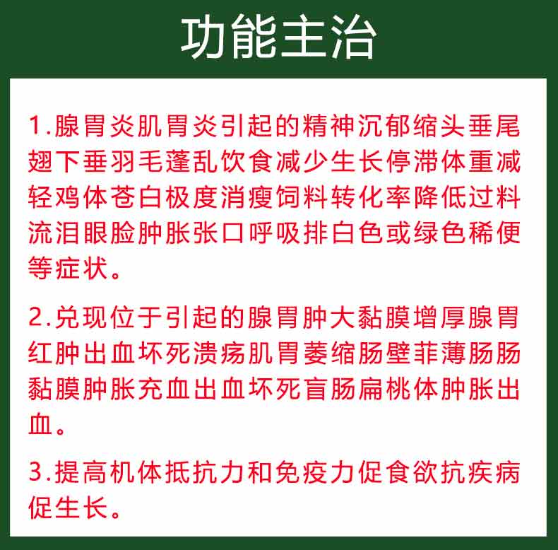 产品功能功效及特点: 1. 腺胃炎肌胃炎引起的精神沉郁缩头垂尾翅下垂羽毛蓬乱饮食减少生长停滞 体重减轻鸡体苍白极度消瘦饲料转化率降低过料流泪眼睑肿胀张口呼吸 排白色或绿色稀便等症状。
