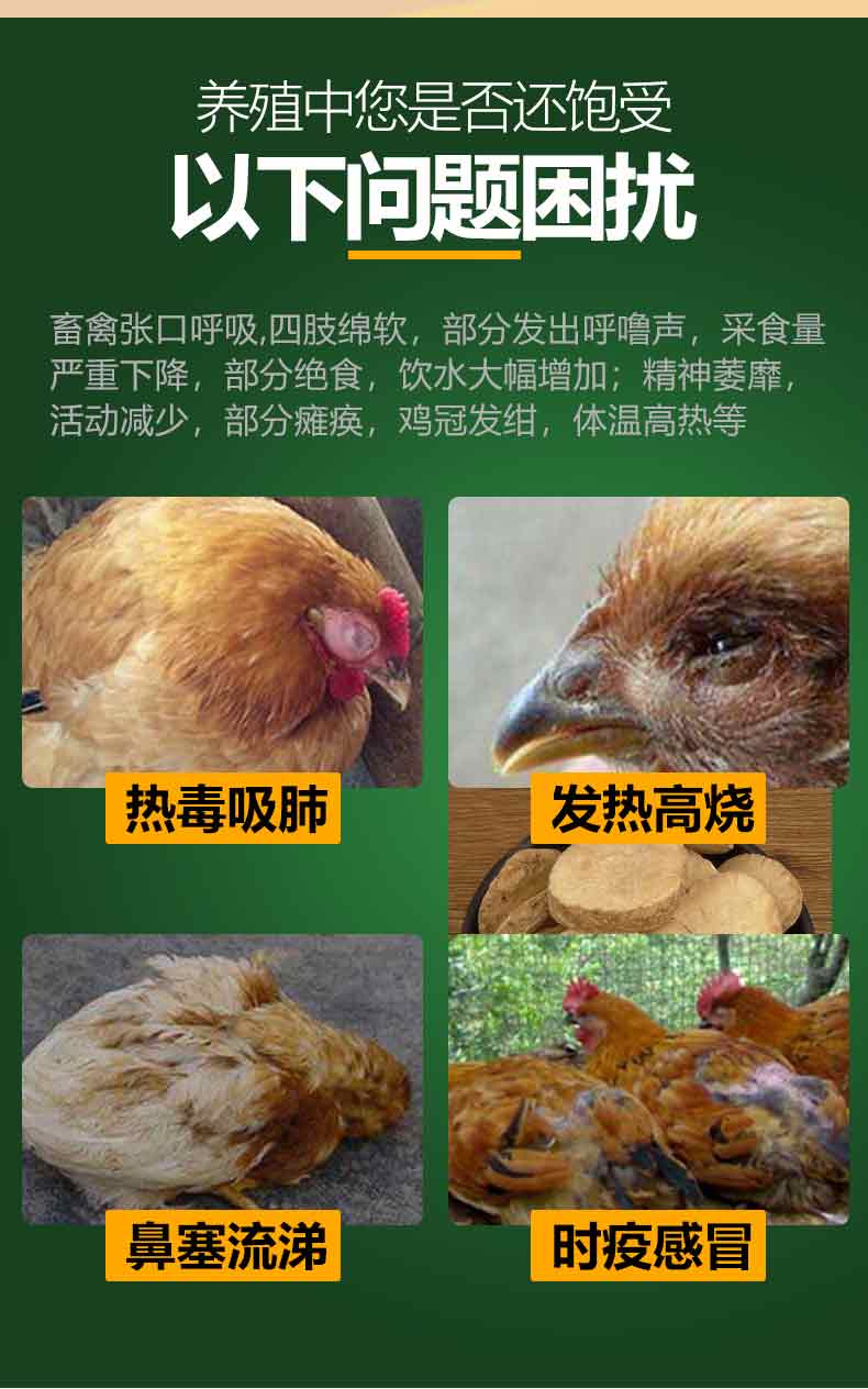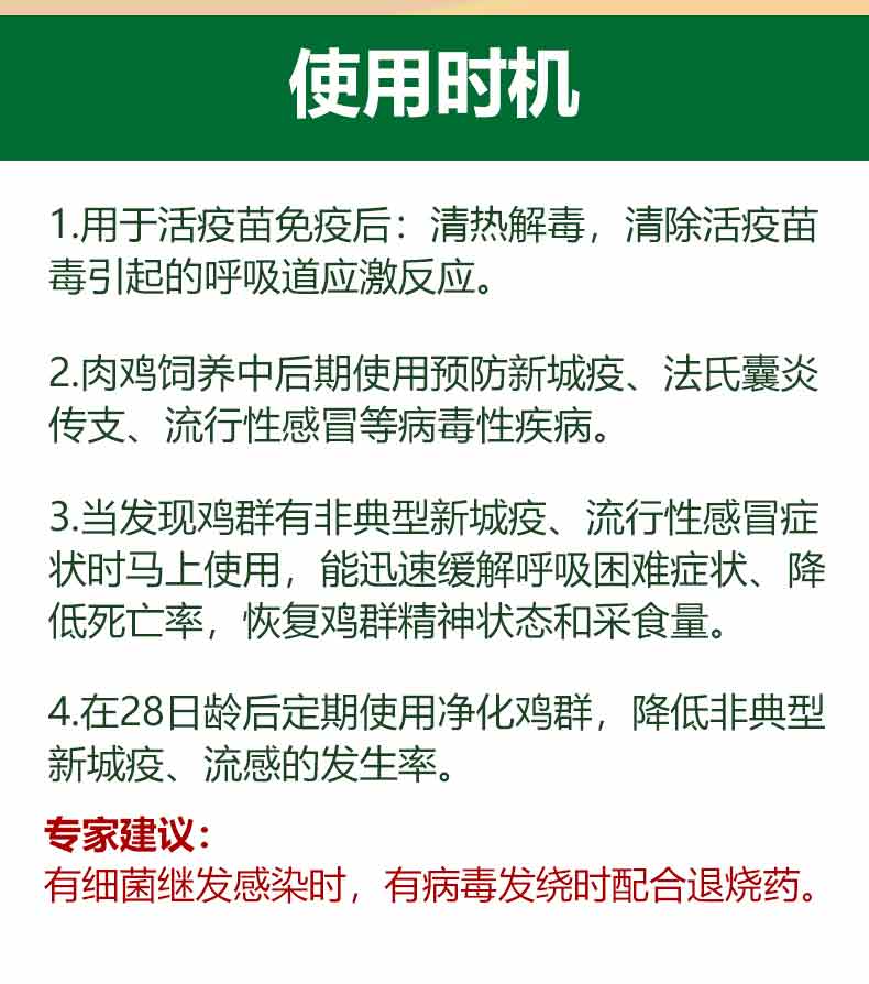 【使用时机】1、用于活疫苗免疫后:清热解毒,清除活疫苗毒引起的呼吸道应激反应。