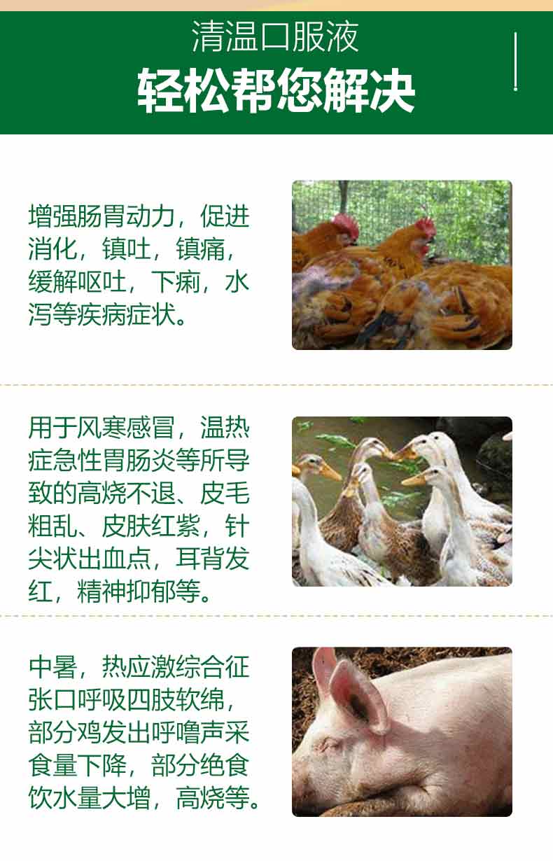 【功能主治】清热解毒,主治外感发热。适用于治疗慢性新城疫、流行性感冒等病毒 性高热疾病,能快速缓解呼吸困难症状、降低死亡、恢复鸡群精神状态 和采食。
