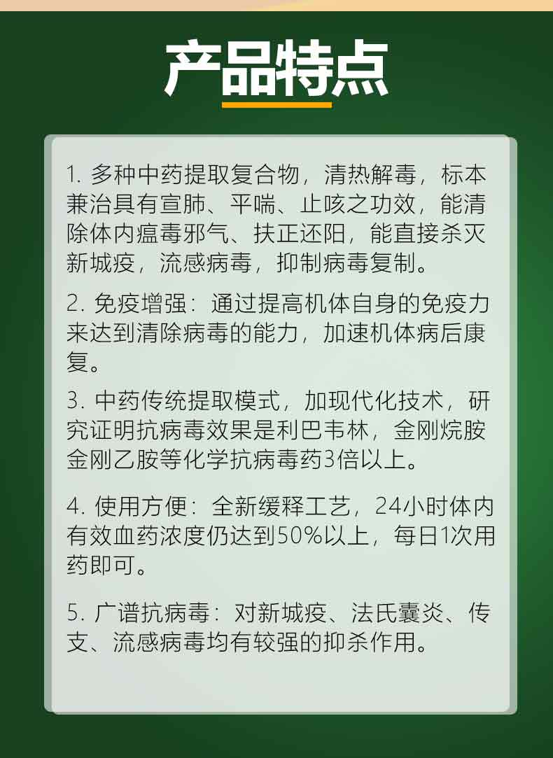【产品特点】1、多种中药提取复合物,清热解毒、标本兼治,具有宣肺、平喘、止 咳之功效。使用本品能清除体内瘟毒邪气,扶正还阳,能直接杀灭 新城疫、流感病毒,抑制病毒复制。