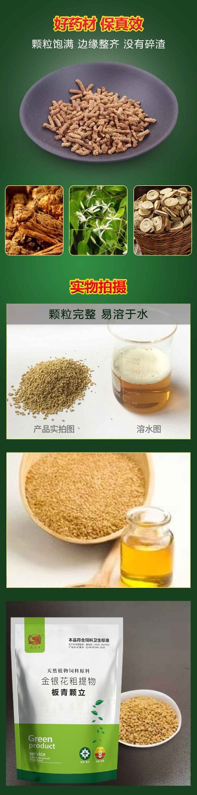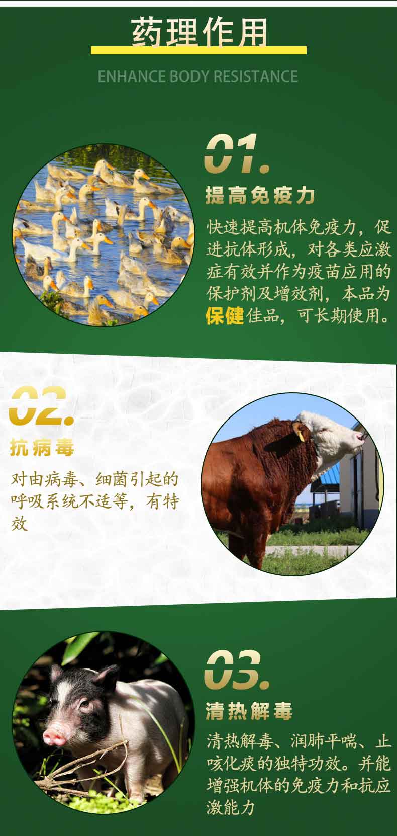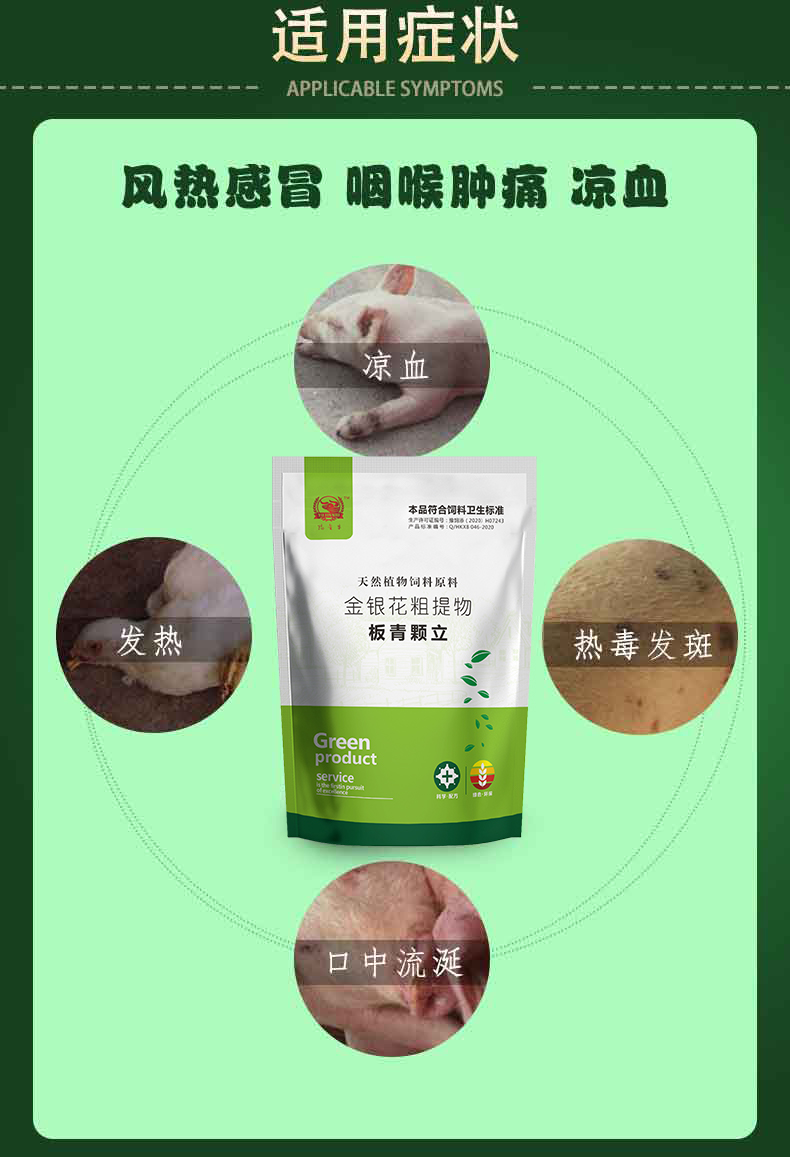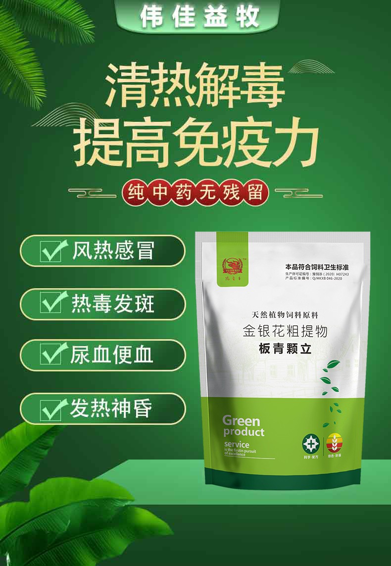 【主要成分】金银花粗提物、杨树花粗提物、黄芪粗提物、当归粗提物、板蓝根、大 青叶、载体。