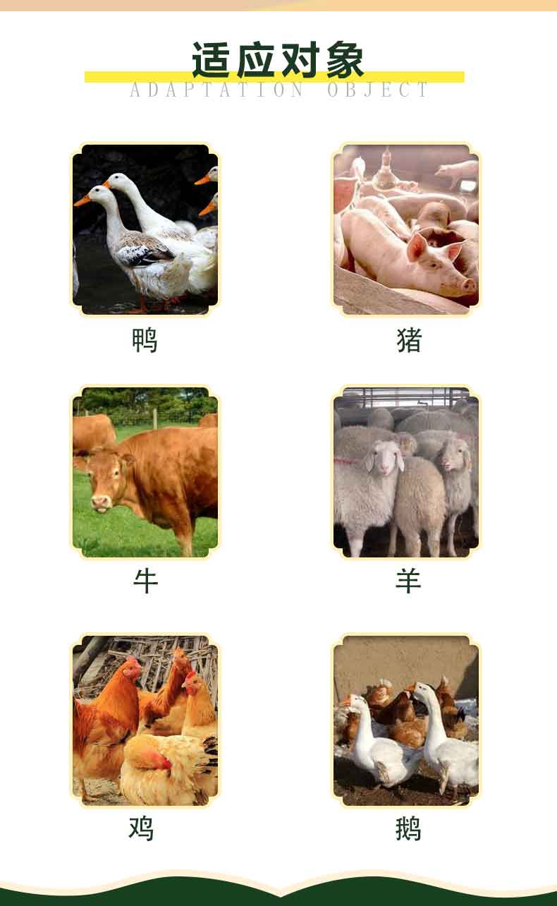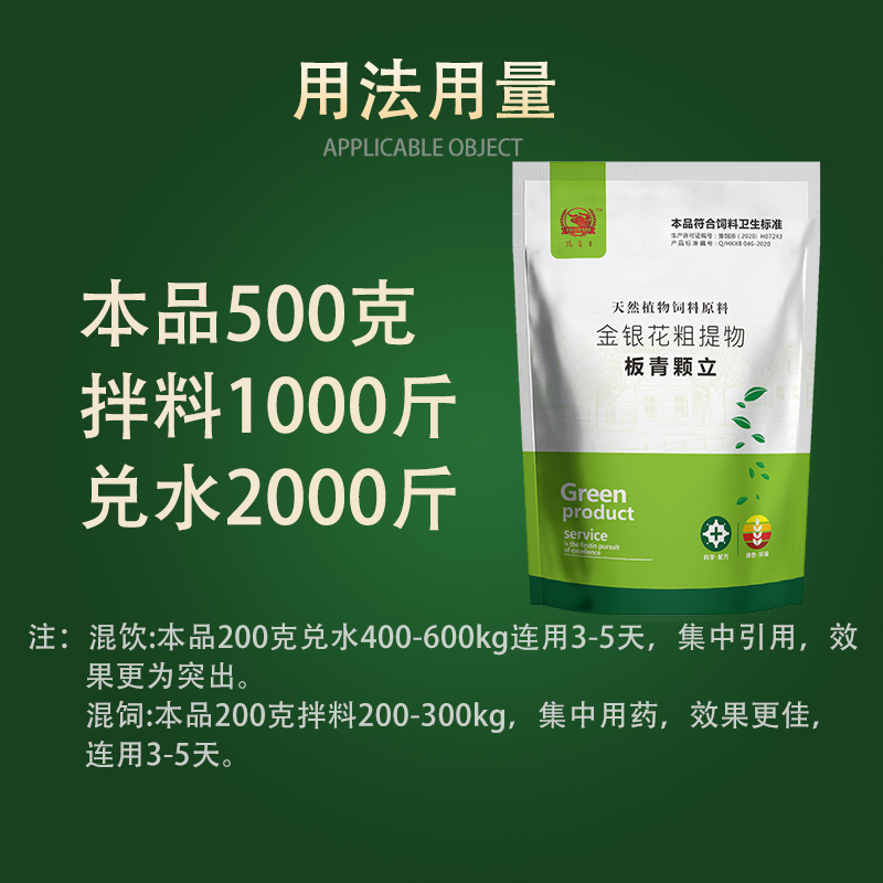 【参考用量】混饮:本品200g兑水400-600kg,连用3-5天,集中饮用,效果更为突出。 混饲:本品200g拌料200-300kg,集中 用药,效果更佳,连用3-5天。