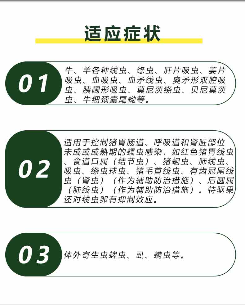 【适 应 症 】1.牛、羊各种线虫、绦虫、肝片吸虫、姜片吸虫、血吸虫、血矛线虫、奥矛形双腔吸虫、胰阔形吸虫、莫尼茨绦虫、贝尼莫茨虫、牛细颈囊尾蚴等。2.适用于控制猪胃肠道、呼吸道和肾脏部位未成或成熟期的蠕虫感染,如红色猪胃线虫、食道口属(结节虫)、猪蛔虫、肺线虫、吸虫、绦虫球虫、猪毛首线虫、有齿冠尾线虫(肾虫)(作为辅助防治措施)、后圆属(肺线虫)(作为辅助防治措施)。还对线虫卵有抑制效应。3.体外寄生虫蜱虫、虱、螨虫等。