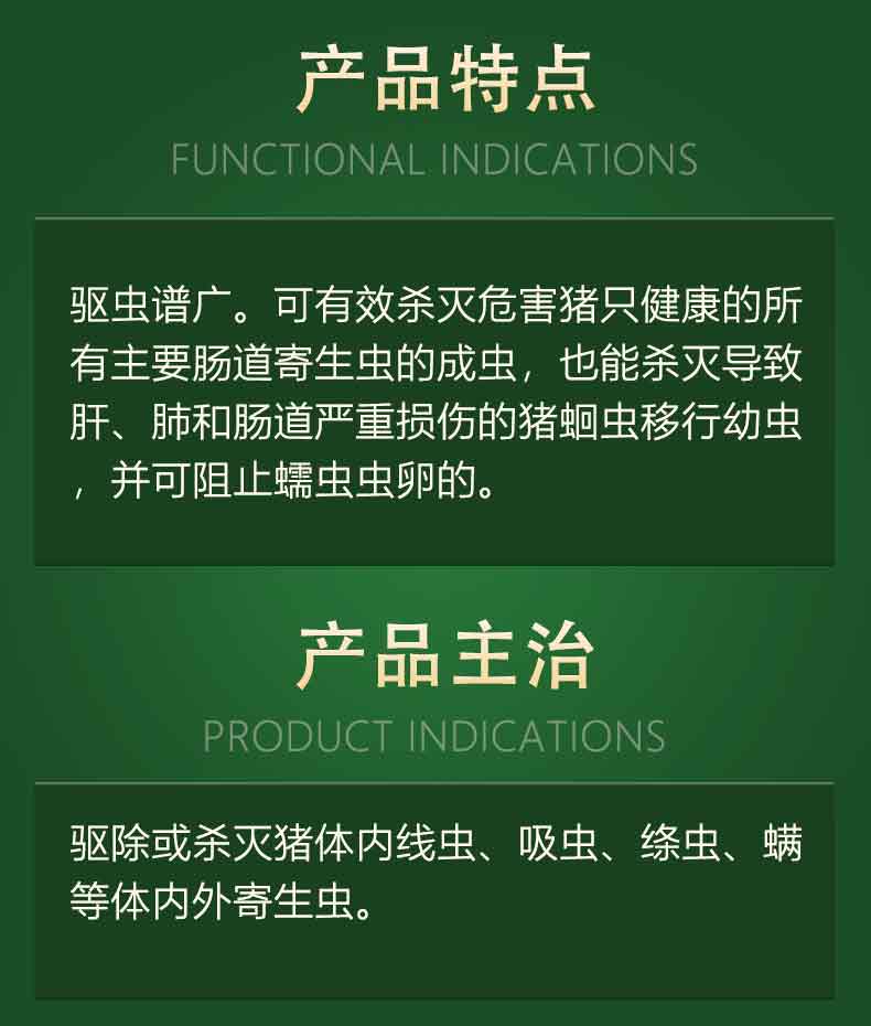 【主 治】驱除或杀灭猪体内线虫、吸虫、绦虫、螨等体内外寄生虫。