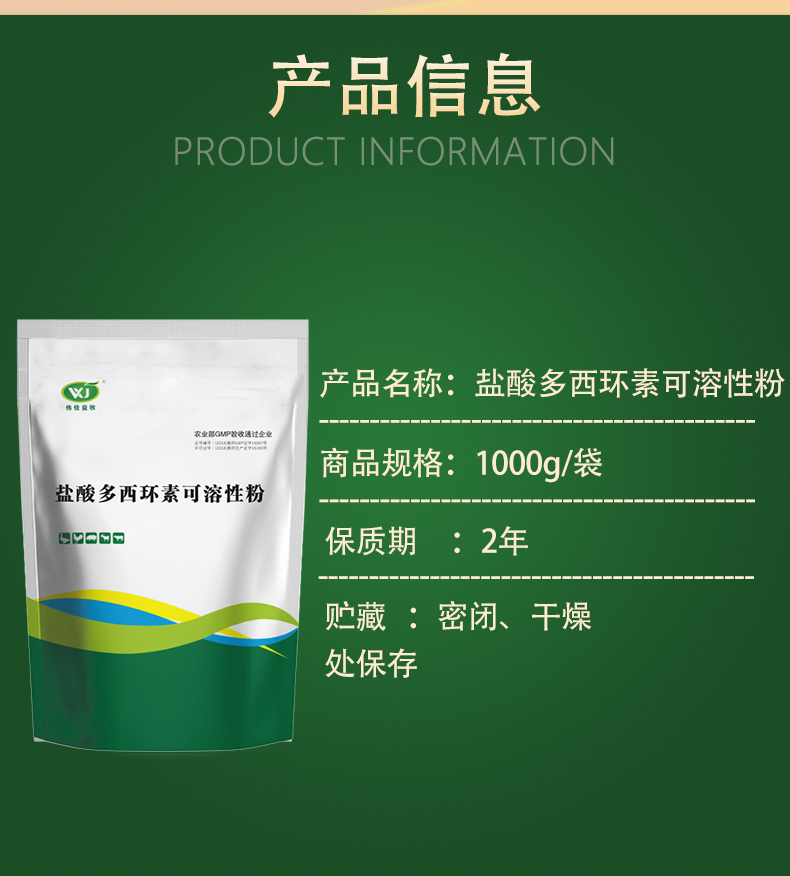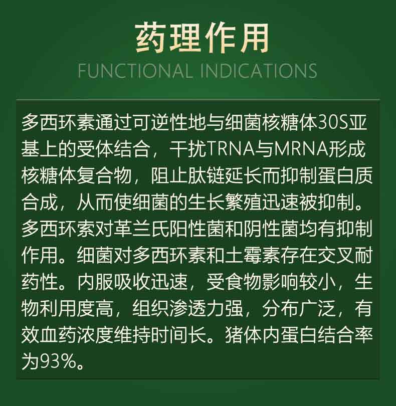 【作用用途】四环素类抗生素。用于治疗猪、鸡革兰氏阳性菌、阴性菌引起的大肠埃希菌病,沙门氏菌病、巴氏杆菌病以及支原体引起的呼吸道疾病。