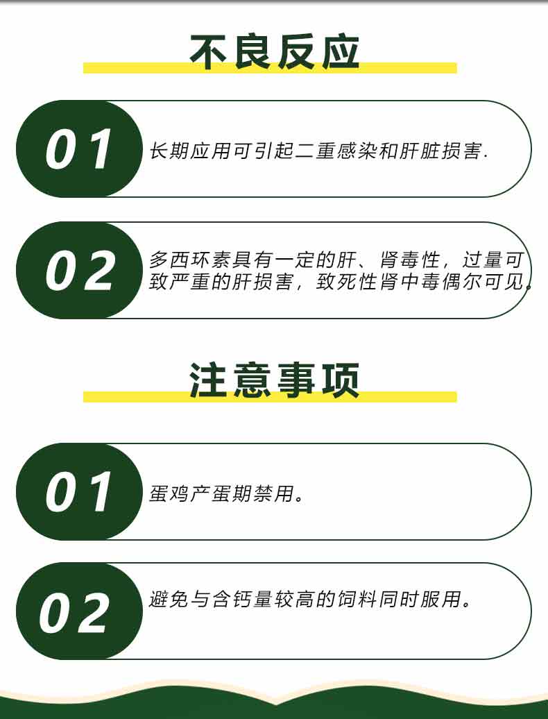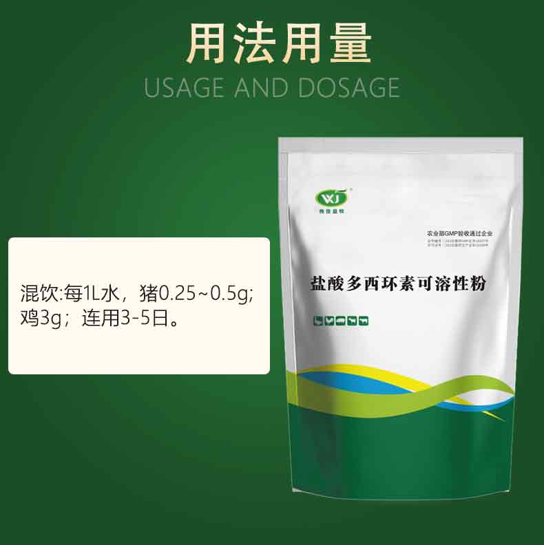 【用法用量】 1、治疗呼吸道病配合氟苯尼考效果更佳,多西环素1000g/吨料+氟苯尼考 1000g/吨料连用7-10天。 2、衣原体治疗1000g/吨连用5~7天。3、附红细胞体1000g/吨连用5~7天。 4、常规预防500g-1000g/吨连用5~7天。 5、以本品计。 混饮:每1L水,猪0.25~0.5g;鸡3g.连用3-5日。